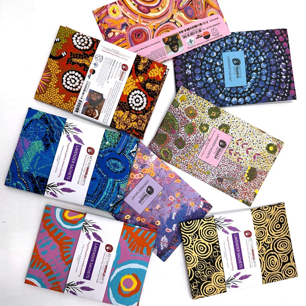 Some very pretty heat bags, lavender sachets and soaps are adorned with licensed professionally produced Aboriginal art.