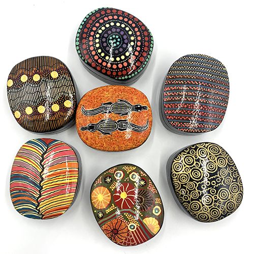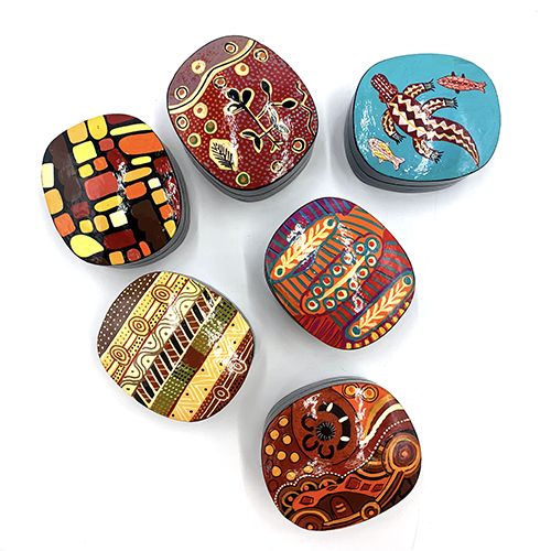 Two kinds of artisanal production are used in the range. Papier Mache hand modelled from recycled paper pulp are hand painted by Kashmiri artisans, practicing their ancient craft of Kare-Kalamdani, hand painting, interpreting licensed aboriginal artworks.